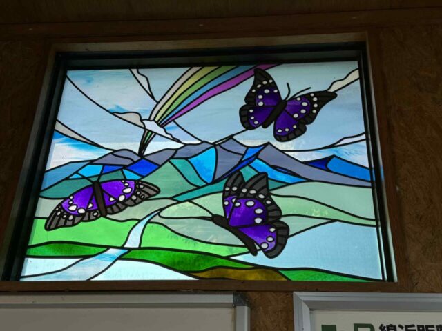 さらに、駅舎の待合室の左右の壁には、オオムラサキと八ヶ岳に生息する「幸せを呼ぶ。青い」のルリビタキと、シラカンバのステンドグラスが設置されていて、素敵な空間になっています。