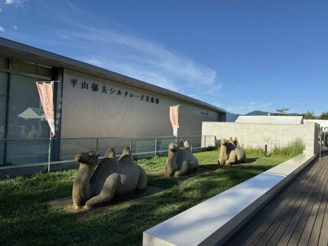 駅前には、平山郁夫シルクロード美術館があり、お洒落な外観の外にあるベンチでは、駅舎を眺めながらのんびりすることができます。